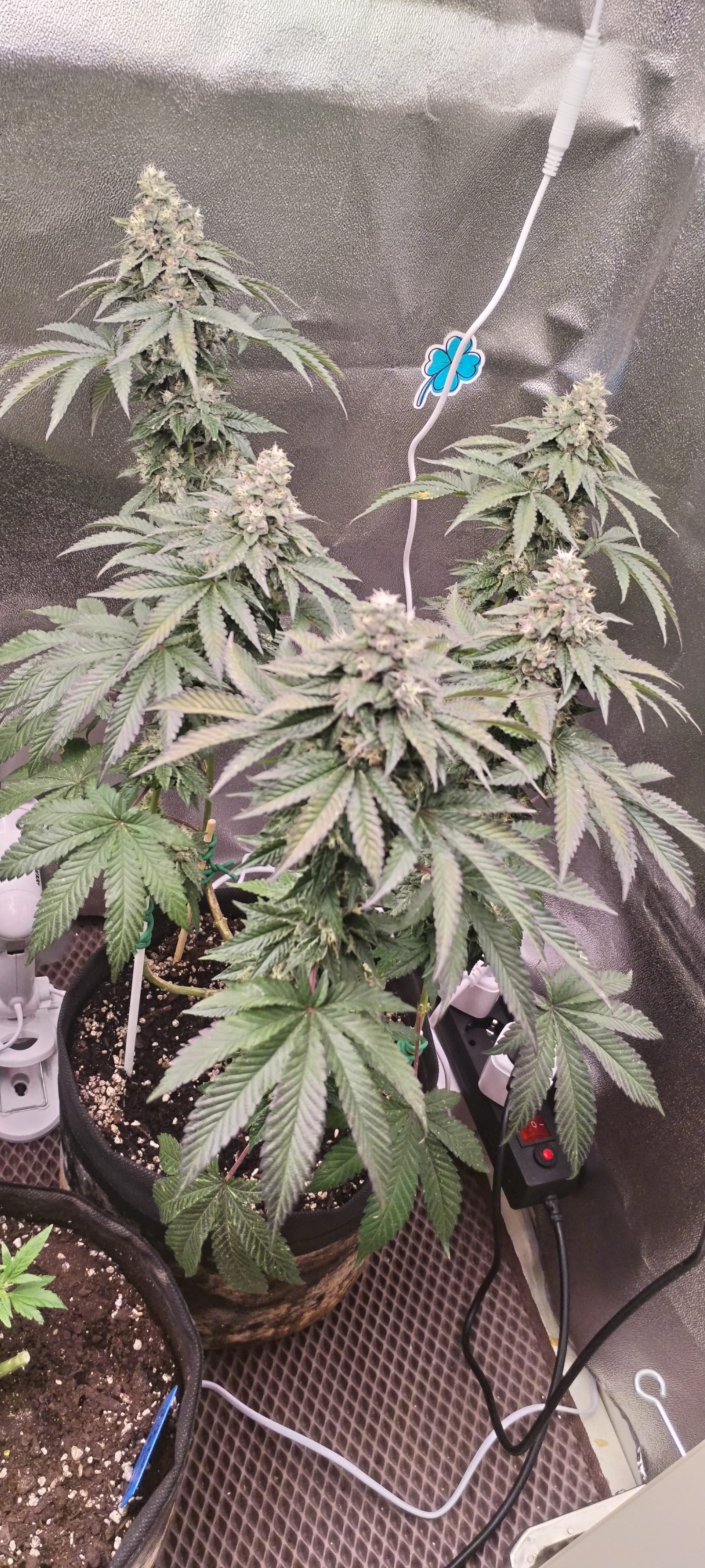 не знаю последствия классической музыки или ему так захотелось, но на одной кроне после 2 дней музыки появилось 2 ответвления. да и вообще как будто кустики себя лучше начали чувствовать, до этого все листья были немного опущены, хотя субстрат был влажный, после классики стали бодрые. сейчас только успеваю лампочки поднимать выше) полив примерно раз в 3-4 дня по 3 литра на 10.5 литров субстрата. пока так же компот. чистой воды еще не было ph 5.5-6.5 всю дорогу. думаю без скрог сетки не обойтись уже, мелочи много в глубине а обрезка и железные колышки уже не очень помогают. да и места в боксе не хватает чтобы свободно раскидать ветки.